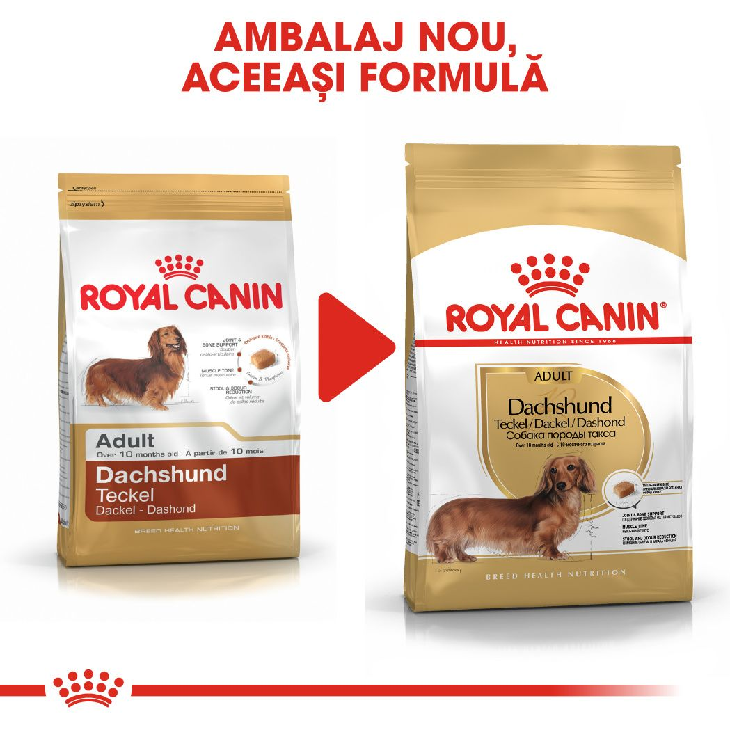 Suport pentru oase şi articulaţii: Dachshund Adult menține sănătatea oaselor şi articulaţiilor câinelui din rasa Dachshund datorită conţinutului adaptat de calciu şi de fosfor. Această formulă exclusivă ajută şi la menţinerea greutăţii optime.