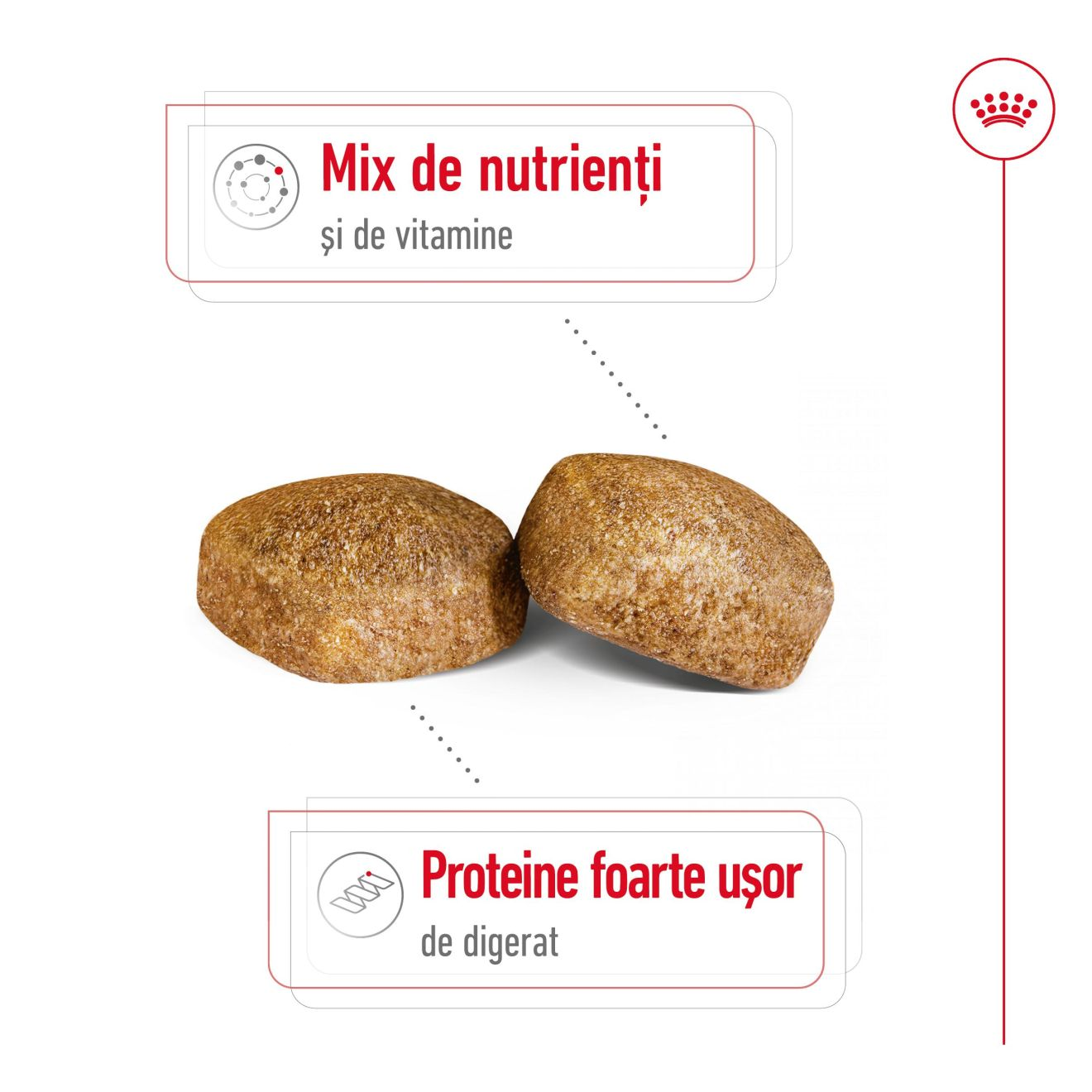Susţine sănătatea digestivă: Proteine foarte uşor de digerat şi un aport echilibrat de fibre alimentare pentru a menţine sănătatea digestivă.