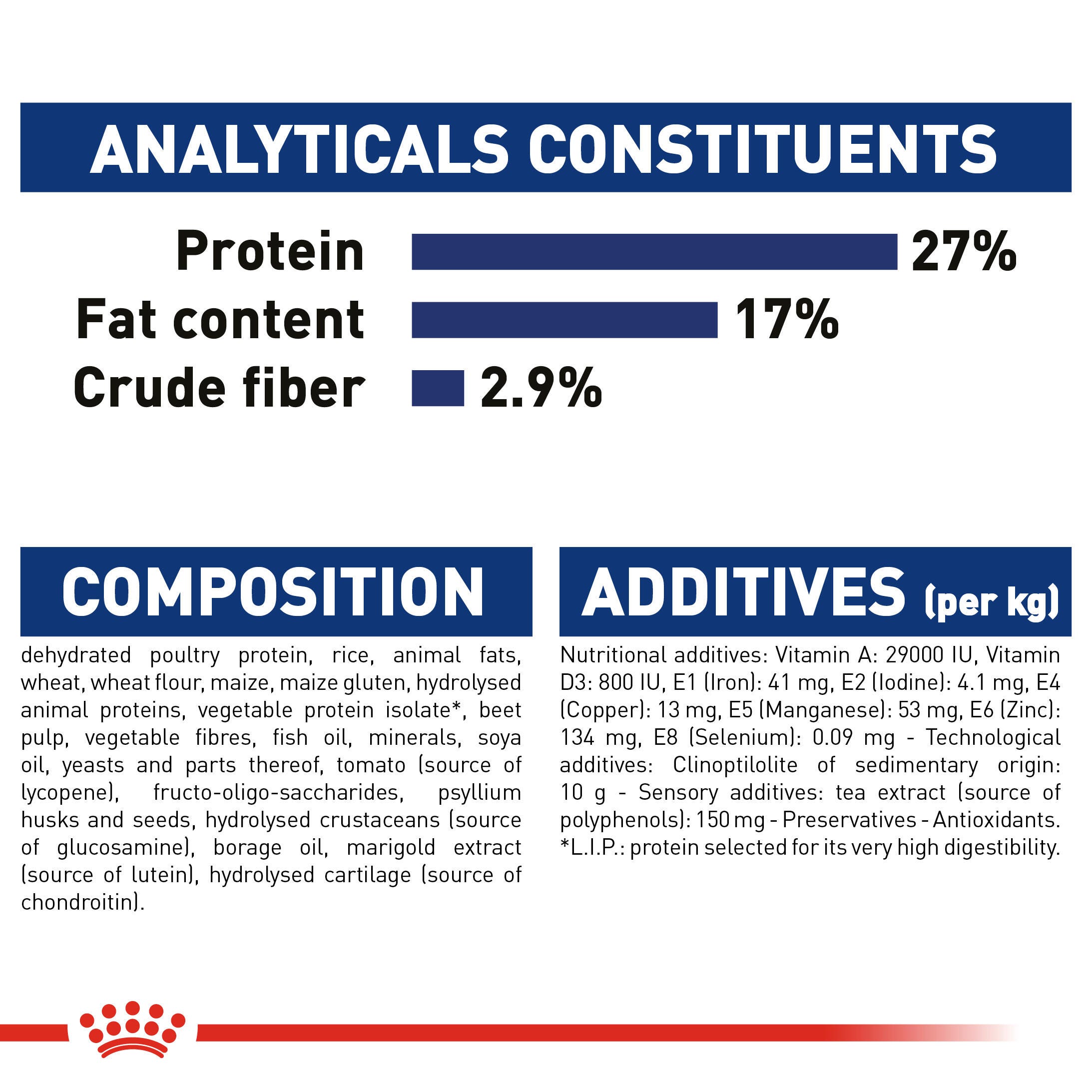 Composition: dehydrated poultry protein, rice, animal fats, wheat, wheat flour, maize, maize gluten, hydrolysed animal proteins, vegetable protein isolate*, beet pulp, vegetable fibres, fish oil, minerals, soya oil, yeasts and parts thereof, tomato (source of lycopene), fructo-oligo-saccharides, psyllium husks and seeds, hydrolysed crustaceans (source of glucosamine), borage oil, marigold extract (source of lutein), hydrolysed cartilage (source of chondroitin).